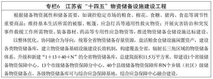提升物資儲(chǔ)備設(shè)施水平。新建或改擴(kuò)建一批技術(shù)先進(jìn)、經(jīng)濟(jì)高效、綠色環(huán)保、平急結(jié)合的省、市、縣三級(jí)物資儲(chǔ)備庫(kù)。多災(zāi)易災(zāi)和人口較多的市縣,應(yīng)按上限標(biāo)準(zhǔn)確定儲(chǔ)備庫(kù)建設(shè)規(guī)模,并根據(jù)實(shí)際適當(dāng)增加儲(chǔ)備庫(kù)點(diǎn)。制定江蘇物資儲(chǔ)備庫(kù)建設(shè)標(biāo)準(zhǔn),按照啟動(dòng)自然災(zāi)害救助應(yīng)急預(yù)案Ⅱ級(jí)響應(yīng)需求,推進(jìn)物資儲(chǔ)備庫(kù)規(guī)模達(dá)標(biāo)建設(shè),其中,省級(jí)建筑面積10000平方米以上,市級(jí)建筑面積5000平方米以上,縣級(jí)建筑面積1000平方米以上。充分利用好全社會(huì)倉(cāng)儲(chǔ)資源,加快物資儲(chǔ)備設(shè)施標(biāo)準(zhǔn)化、信息化、智能化改造。
