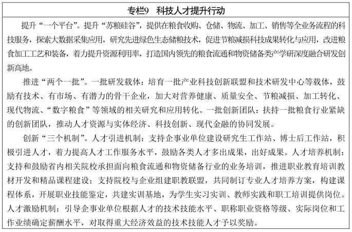 突出創(chuàng)新引領(lǐng),強(qiáng)化科技和人才支撐,加強(qiáng)糧食產(chǎn)業(yè)技術(shù)創(chuàng)新和糧機(jī)裝備研發(fā),推進(jìn)糧食和物資儲(chǔ)備科技創(chuàng)新平臺(tái)建設(shè),提升糧食流通和物資儲(chǔ)備數(shù)字化水平,進(jìn)一步增強(qiáng)糧食流通和物資儲(chǔ)備發(fā)展新動(dòng)能。